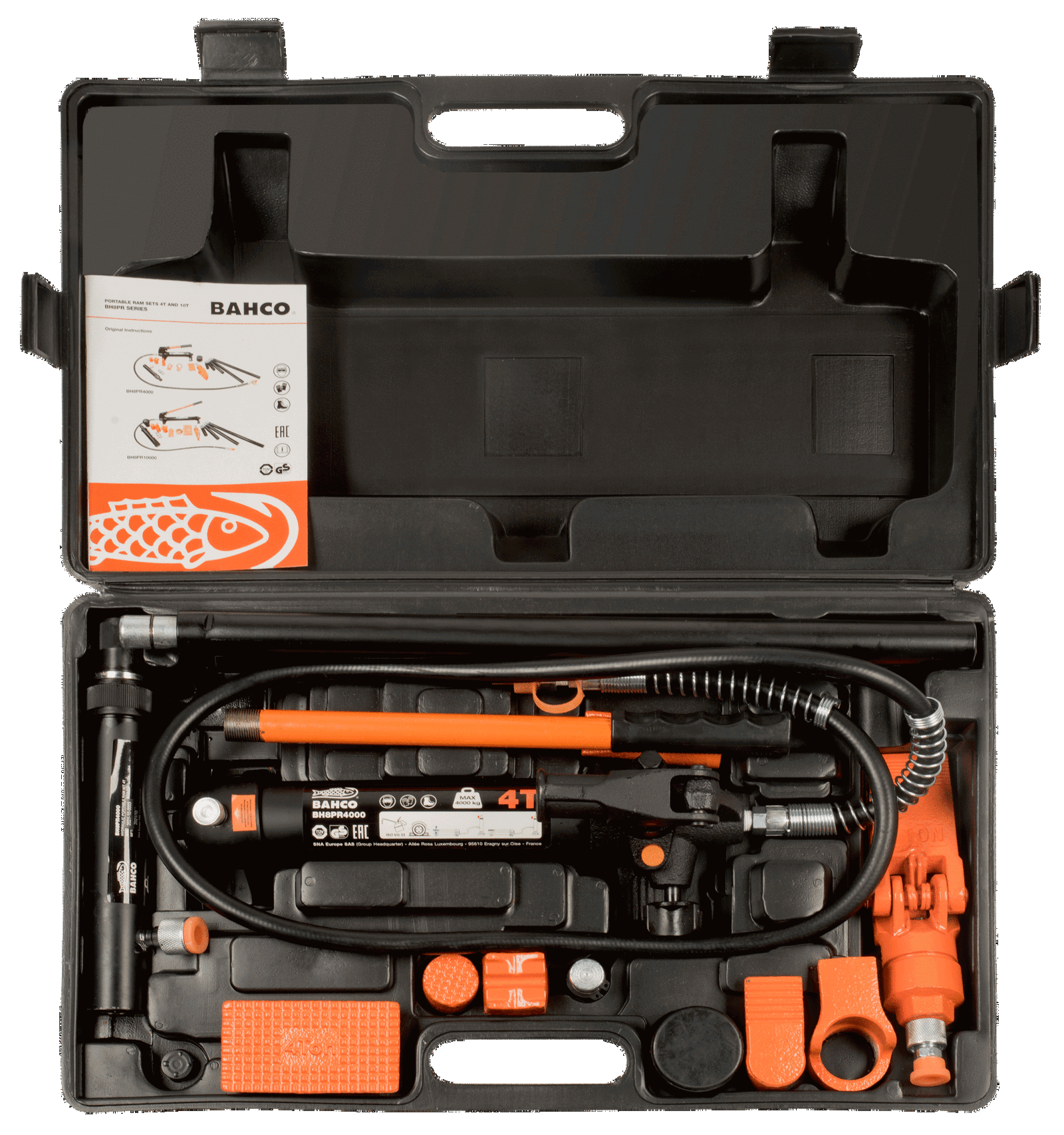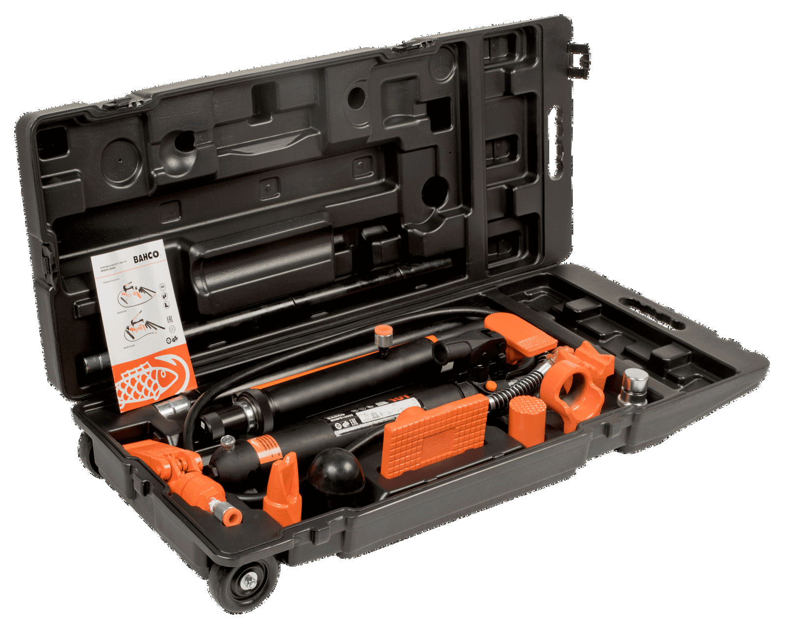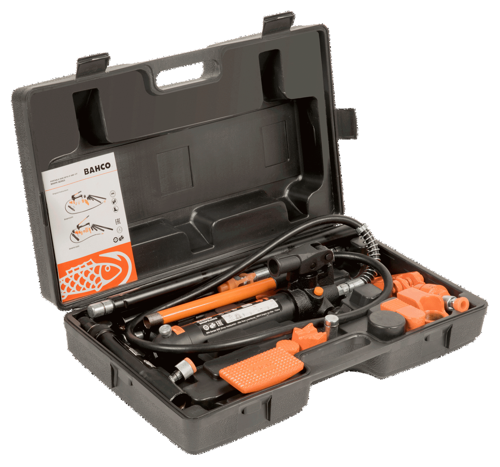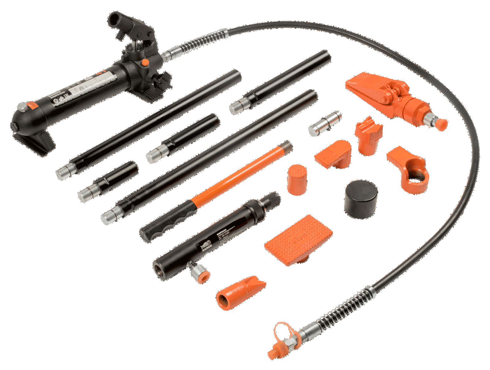 - Zestaw zawiera: Pompka ręczna – siłownik, Wąż, Rozpierak, Nasadka kątowa, Nasadka gumowa, Nasadka płaska, Podstawa “V” 90°, Podpórka nacinana, Łącznik, Wybór przedłużek
