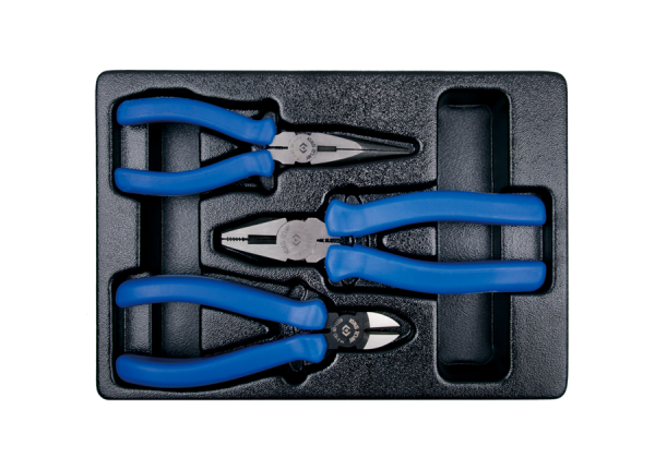 Zestaw szczypiec we wkładzie do wózka warsztatowego King Tony. W zestawie znajdują się standardowe kombinerki, cążki obcinające oraz szczypce wąskie Karta produktu – 9-40103GP