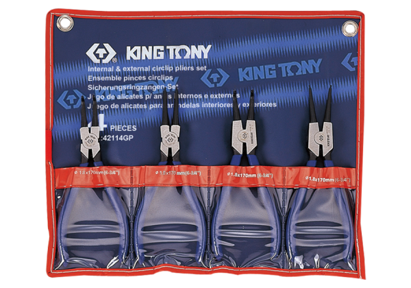 Zestaw szczypiec do pierścieni Segera firmy King Tony. Zestaw w wygodnym etui do powieszenia na ścianie warsztatu. W zestawie znajdują się 4 pary szczypiec: do pierścieni wewnętrznych proste oraz wygięte, a także do pierścieni zewnętrznych w wersji prostej oraz wygiętej. Karta produktu – 42114GP