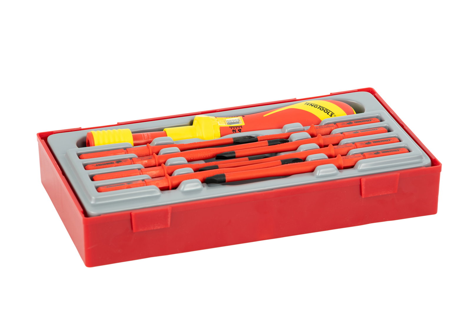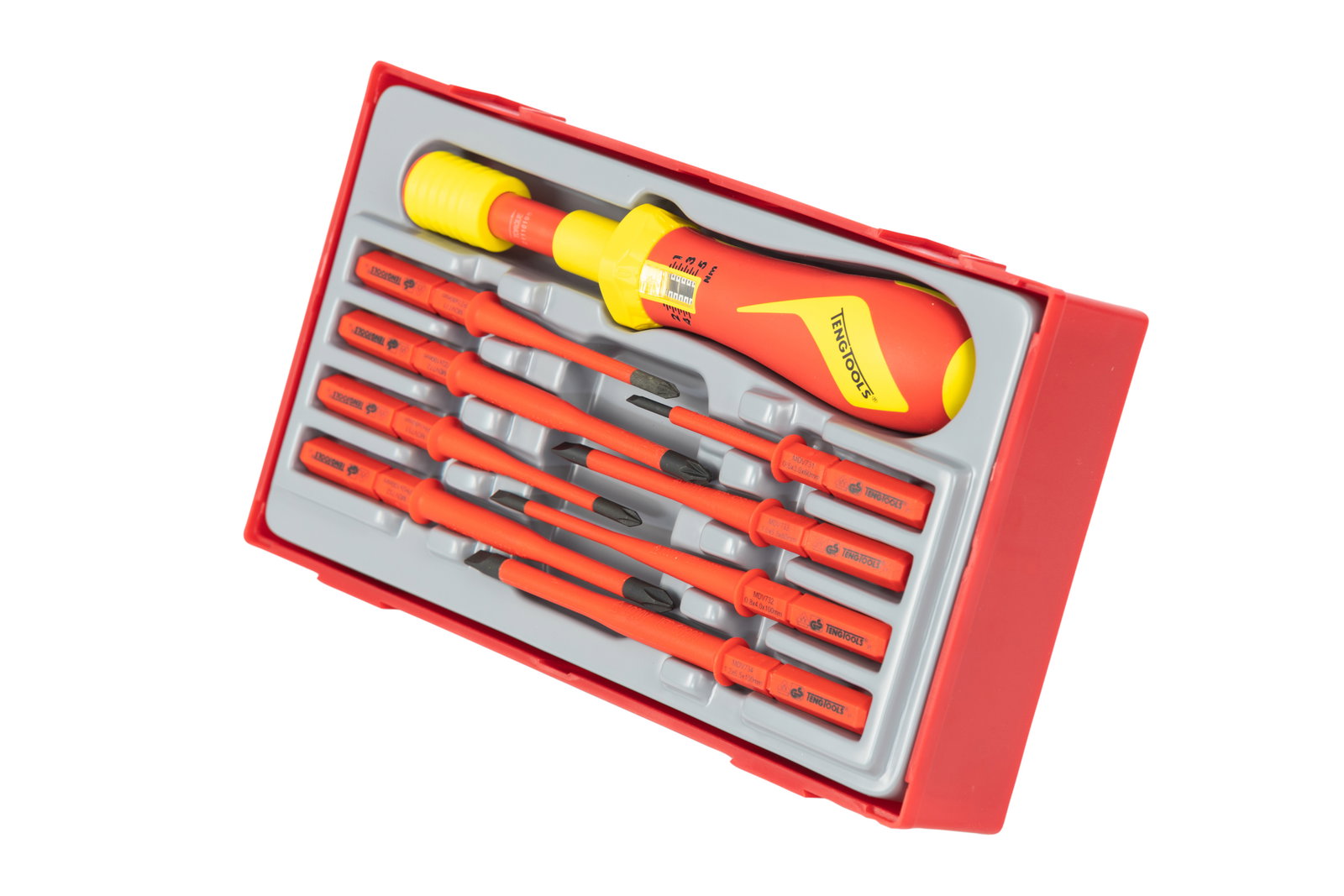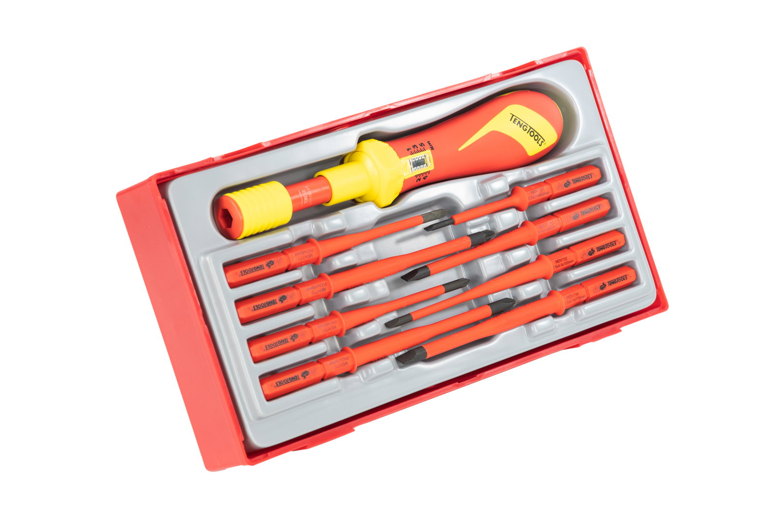9-elementowy zestaw wkrętaka dynamometrycznego izolowanego 1000 V wraz z trzonami wkrętakowymi. Trzony posiadają mniejszą średnicę końcówki umożliwiającą łatwiejszy dostęp do śrub w wąskich przestrzeniach. Zawiera trzony końcówkami płaskimi oraz krzyżowymi Phillips PH i Pozidriv PZ. Zintegrowana izolacja ochronna z dwoma kolorami, wyraźnie wskazująca, czy doszło do uszkodzenia izolacji. Dostarczany w zasobniku pasującym do skrzynek i wózków narzędziowych. Zaprojektowane i wyprodukowane zgodnie z normami DIN, ISO i IEC60900 (EN60900).