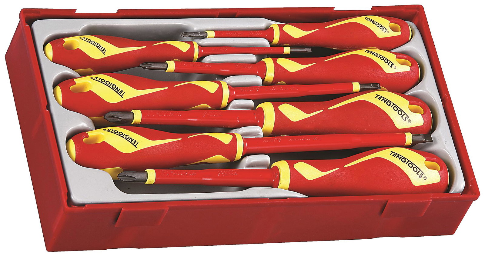 Zestaw zawierający 7 izolowanych wkrętaków (płaskich oraz krzyżowych Phillips i Pozidriv), wykonanych zgodnie z normą IEC 60900 do prac pod napięciem do 1000V (przez specjalnie przeszkolony personel). Dostarczany w pojemniku z tworzywa sztucznego z odłączaną pokrywą. Pasuje do skrzynek i wózków narzędziowych Teng Tools.