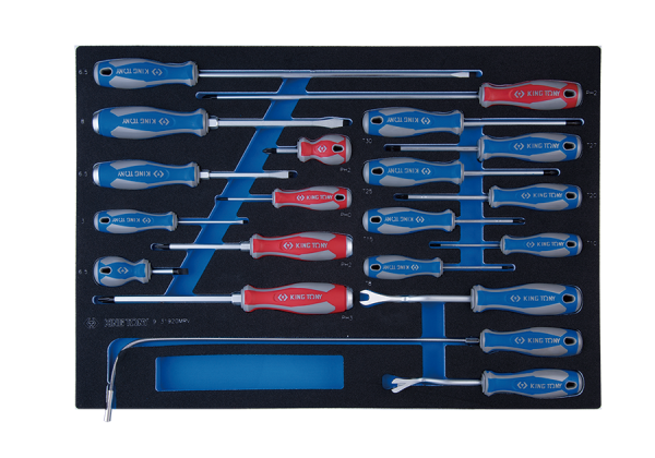 Zestaw wkrętaków King Tony 20 elementów, wkład do wózka. W skład zestawu wchodzą wkrętaki płaskie 3 x 75, 6.5 x 38, 6.5 x 300, krzyżakowe PH0 x 60, PH2 x 38, PH2 x 300, TORX T8H x 75, T10H x 75, T15Hx 75, T20H x 100, T25H x 100, T27H x 100, T30H x 125T, wkrętaki do pobijania płaskie 6.5 x 100, 8 x 150 i krzyżakowe PH2 x 100, PH3 x 150, dwa chwytaki do podważanie zapinek tapicerki i chwytak magnetyczny o średnicy końcówki 5 mm i długości całkowitej 565 mm. Wymiary wkładu z pianki EVA 560 x 375 mm.