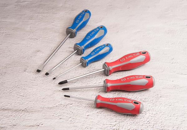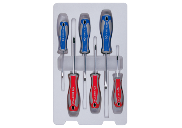 Zestaw 6 wkrętaków King Tony. W zestawie śrubokręty krzyżakowe No.0x60, No.1×80, No.2×100 oraz płaskie 3×75, 5.5×100, 6.5×150 Karta produktu – 31116MR