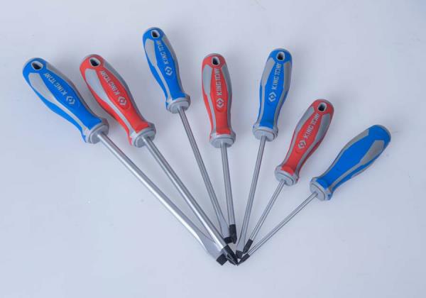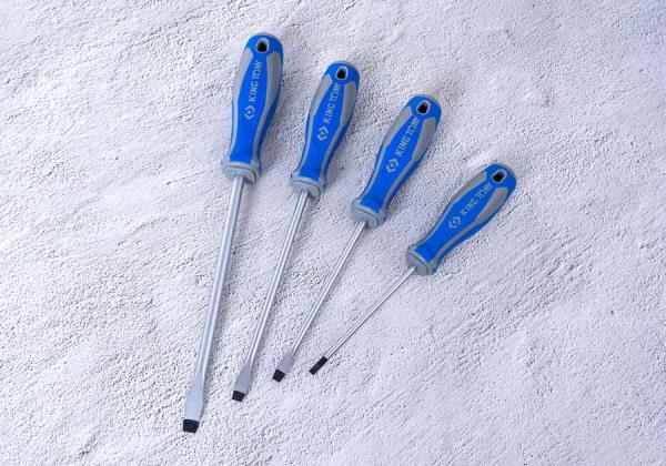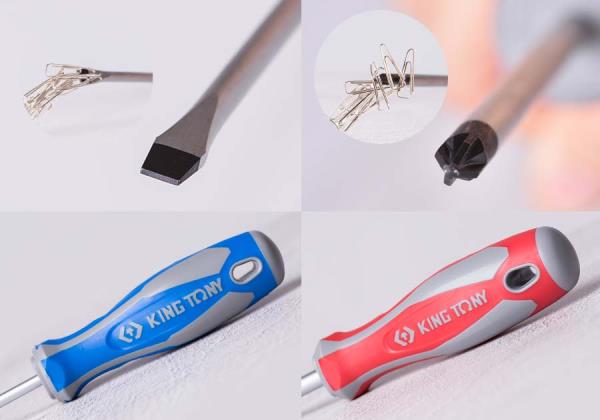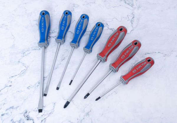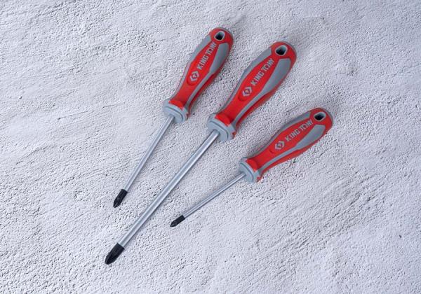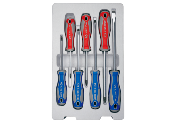 Zestaw wkrętaków pozidriv oraz płaskich King Tony. Każdy wkrętak wykonany z wysoką precyzją, posiada gumową rączkę ułatwiającą pracę. W zestawie znajdują się wkrętaki pozidriv w rozmiarach: No.1×80, No.2×100, No.3.×150 oraz płaskie 4×100, 5.5×125, 6.5×150, 8×175. Karta produktu – 30127MR