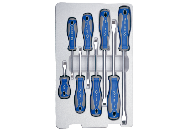 Zestaw wkrętaków płaskich King Tony. Każdy wkrętak wykonany z wysoką precyzją, posiada gumową rączkę ułatwiającą pracę. W zestawie 8 śrubokrętów płaskich w rozmiarach 3×75, 5×75, 5×100, 8×150, 8×200, 6.5×100, 6.6×150, 6.5×38 Karta produktu – 30118MR