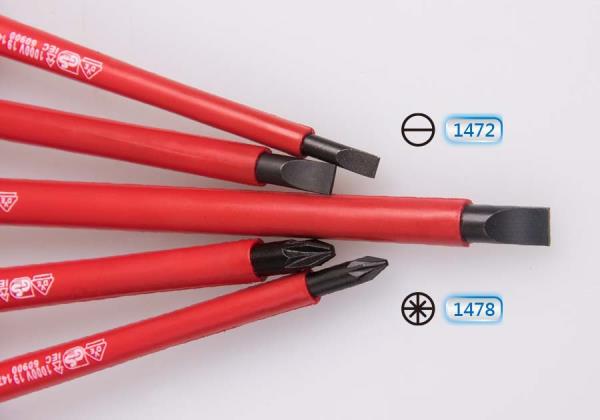 ZESTAW WKRĘTAKÓW IZOLOWANYCH 5 cz. POZIDRIV No.1 x 100, No.2 x 100, PŁASKIE 4 x 100, 5,5 x 125, 6,5 x 150. Stal stopowa wanadowa, uchyt PP +TPR, chromowany z czarną końcówką. IEC 60900:2004