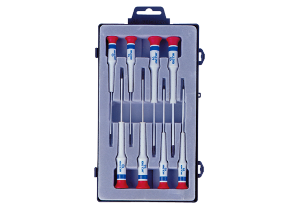 Zestaw wkrętaków precyzyjnych King Tony w plastikowym pudełku z uchwytem do powieszenia. Zestaw dla majsterkowiczów, do prac precyzyjnych. W zestawie znajduje się 8 śrubokrętów w rozmiarach: krzyżak No.000×75, No.00×75, No.0x75, No.1×75 oraz płaski 1.5×75, 2.0×75, 2.5×75, 3.0×75. Karta produktu – 32118MR