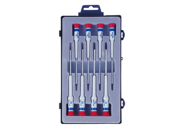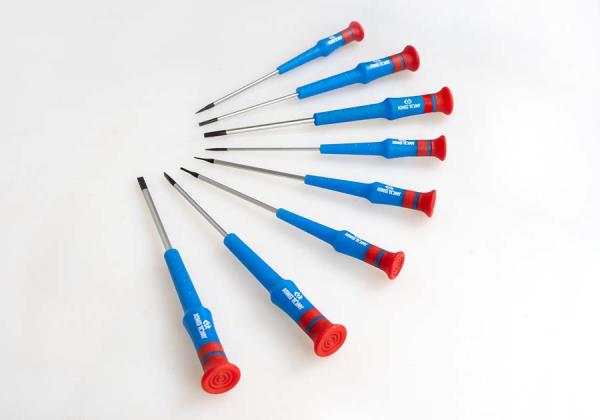 Zestaw płaskich wkrętaków precyzyjnych King Tony. W zestawie 8 śrubokrętów w rozmiarach 1.0×75, 1.5×75, 1.8×75, 2.0×75, 2.5×75, 3.0×75, 3.5×75, 4.0×75 Karta produktu – 32218MR