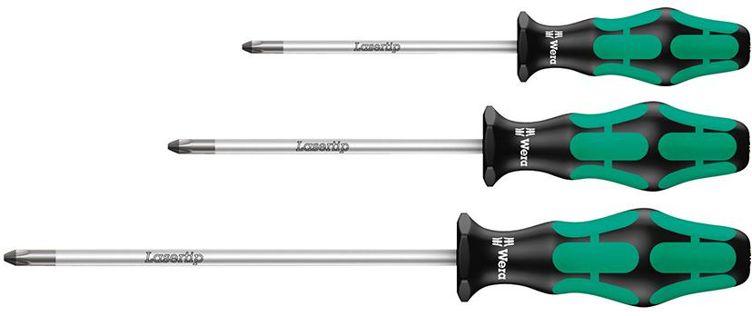 Trzpień okrągły z lasertip i mikroskopijnie chropowatą powierzchnią. Zmniejszona siła nacisku zapobiega ześlizgiwaniu się z łba śruby. Z 3-komponentową rękojeścią Kraftform® Plus ergonomiczną, ze zintegrowanymi strefami miękkimi dla lepszego chwytu, sześciokątne zabezpieczenie przed staczaniem się narzędzia. Dodatkowo wkrętaki posiadają wytłoczenie z symbolem napędu i wielkości.
