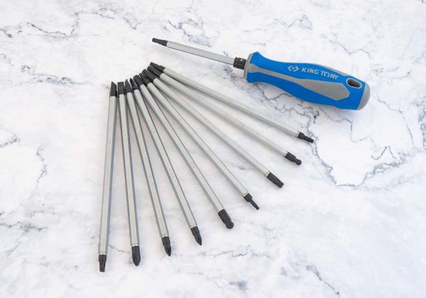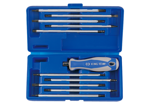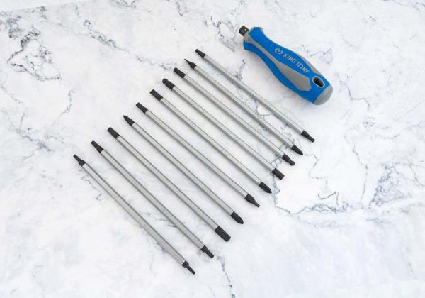 Zestaw wkrętaków z wymiennymi grotami King Tony. Zestaw w plastikowym pudełku zawiera uniwersalną, gumowo-plastikową rączkę oraz 10 grotów o długości 125 mm. Karta produktu – 32518MR02