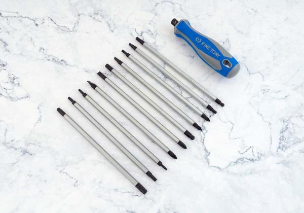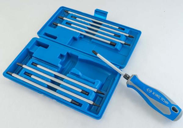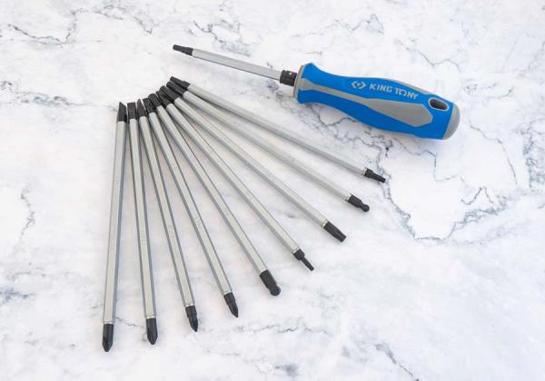 Zestaw wkrętaków z wymiennymi grotami King Tony. Zestaw w plastikowym pudełku zawiera uniwersalną, gumowo-plastikową rączkę oraz 10 wkładów. Rozmiary wkładów: płasko-krzyżakowe 4.0–PH1, 6.0–PH2, płaski-pozidriv 5.0xPZ1, 7.0xPZ2, TORX T10–T15, T20–T25, T30–T40, HEX 4.0–4.0, 5.0–5.0, 6.0–6.0. Karta produktu – 32518MR01
